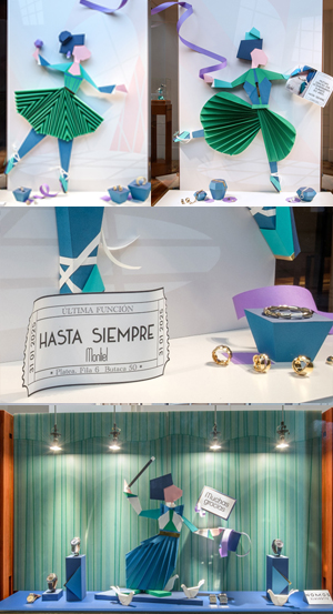 En las tres vitrinas principales, que dan a la Avenida Carlos III, hemos representado un espectáculo de danza. Como curiosidad, destaca el personaje central que lleva en sus manos el libreto de la obra, cuyo texto es un agradecimiento a los clientes por la confianza durante estos sesenta años. También destaca el ticket que hemos diseñado para acudir a este particular evento.